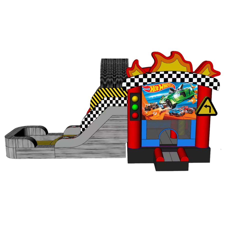 Looking for an exciting and thrilling addition to your upcoming event or party? Look no further than our Raceway Jump N' Slide! This 27ft wide racing-themed bounce house is perfect for children who love bikes, cars, trucks, speed, and hot wheels. Whether it's a birthday party, racing event, promotion, or any private or public gathering, this inflatable will surely be a hit!
