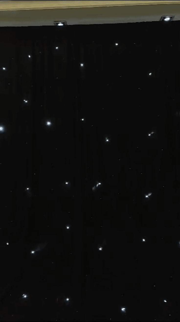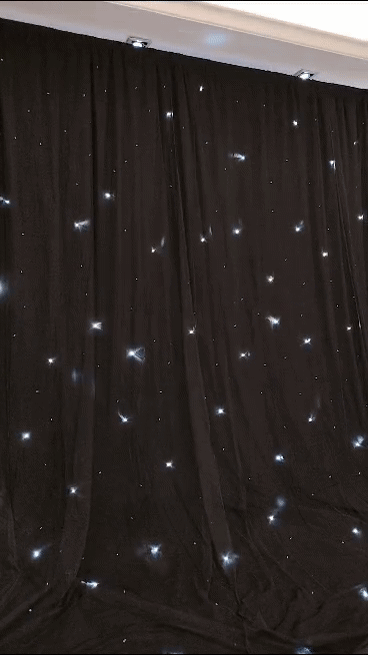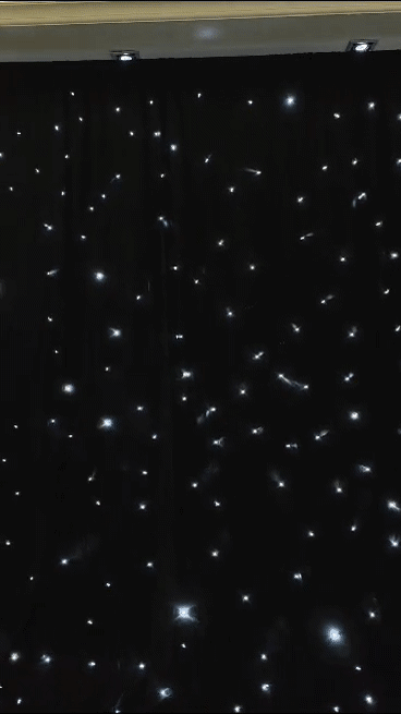 Perfect for any setting, the 12ft Starlight Drape offers multiple light effects and a music/sound-activated mode, ensuring your backdrop is always in sync with the mood of your event. With 17 different programs and an easy-to-use control system, including DMX, sound active, and automatic modes, you can effortlessly adapt the ambiance to suit your needs.