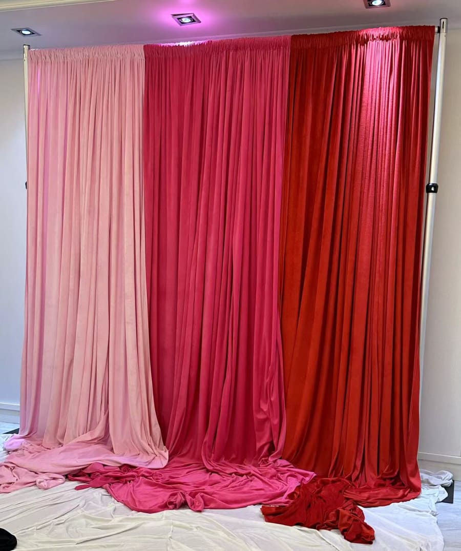 Available in a stunning range of colors including crisp white, classic black, serene baby blue, vibrant sky blue, regal royal blue, bold fuchsia pink, gentle light pink, and passionate red, our velour drapes cater to any theme or décor style. Choose the perfect hue to match your event’s color palette.