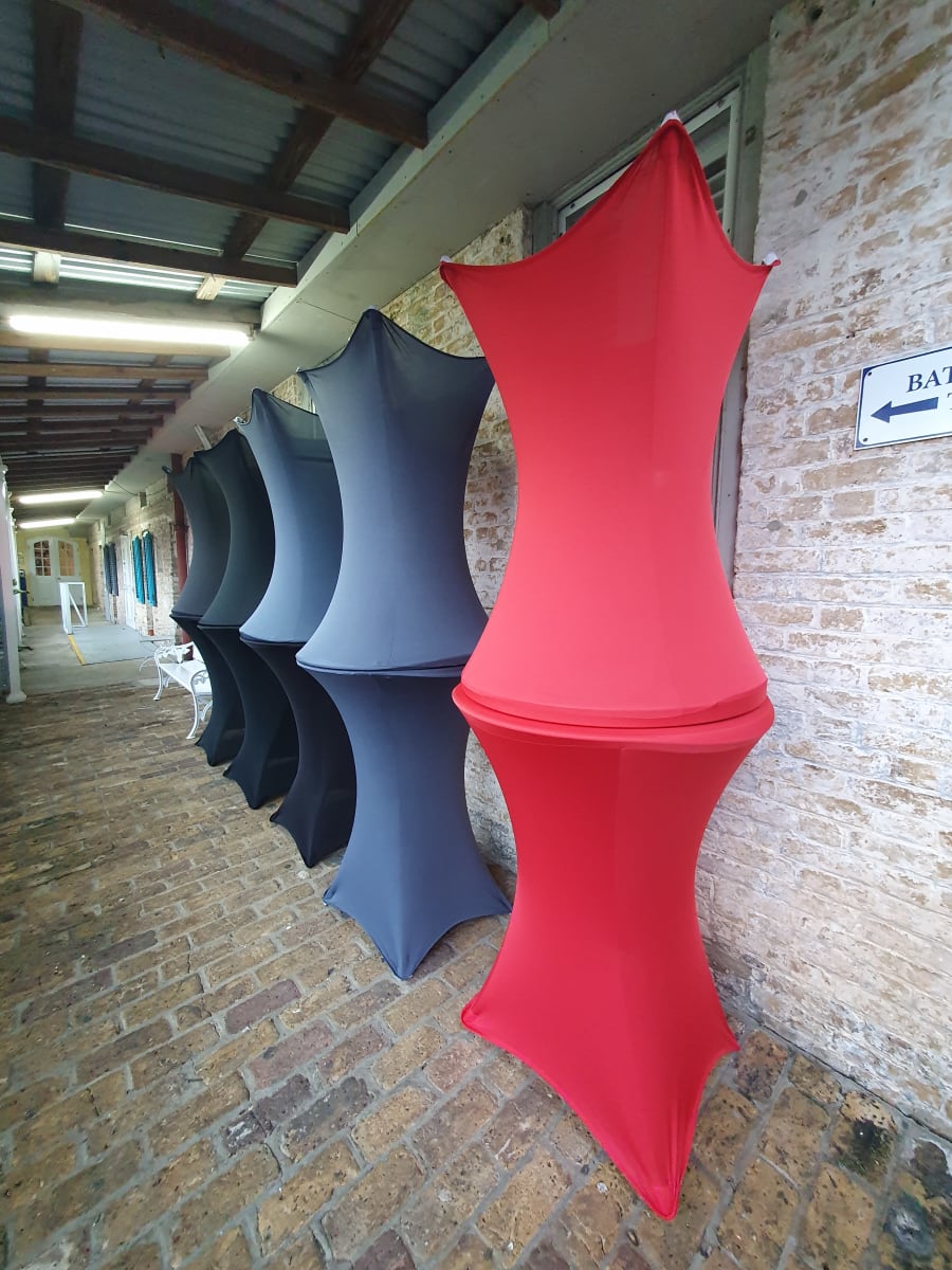 These 32 inches diameter x 43 inches table height cocktail spandex fitted tablecloth are for round cocktail table with 4 legs base. Our High folding cocktail table covers are suitable for events such as weddings, birthdays, showers, dinner rehearsals, corporate parties and simple family functions and whenever there is a requirement for functional, practical tables that are easy to use and to transport.