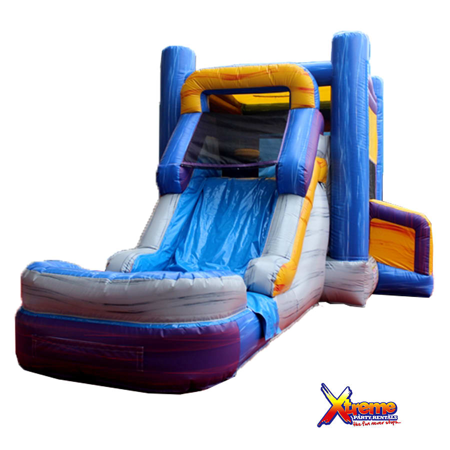 It's name is in its beauty. This 25ft jump 'n' slide is made of beautiful marble colours; purples, greys, blues and yellows with a grain of other accent colors running both horizontal and vertical. It features a bouncer interior, obstacles, basketball hoop and a climb step which leads to a slide. This bouncer can be used wet or dry. For our dry option please click here 13ft x 25ft Marble Jump N Slide-No Theme