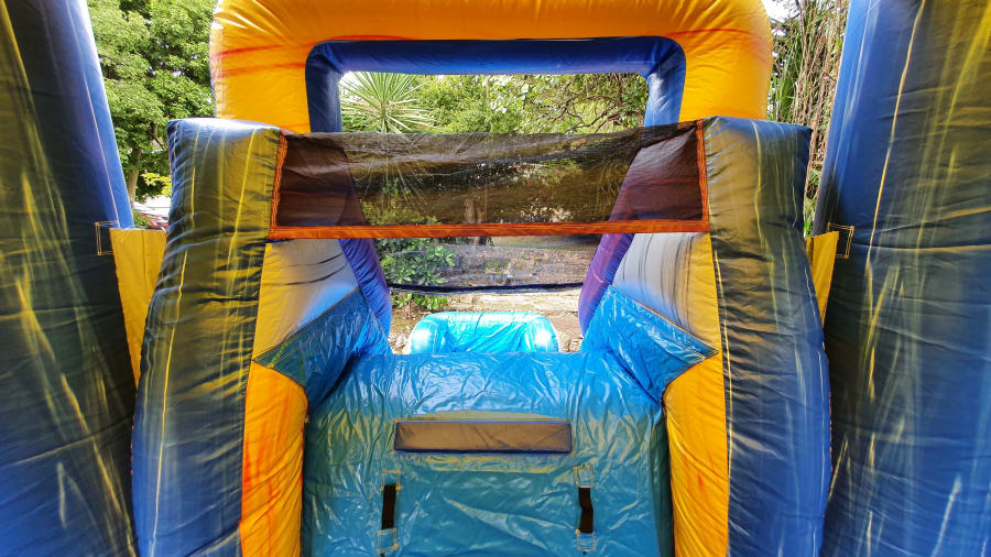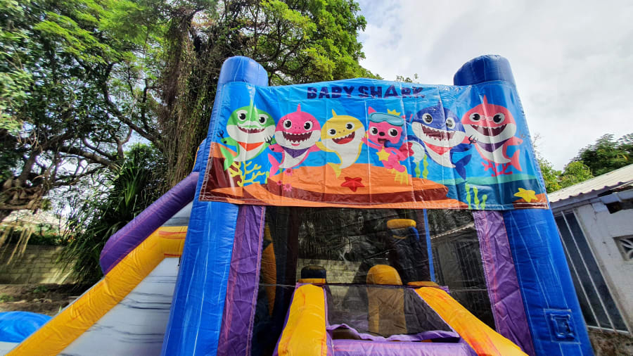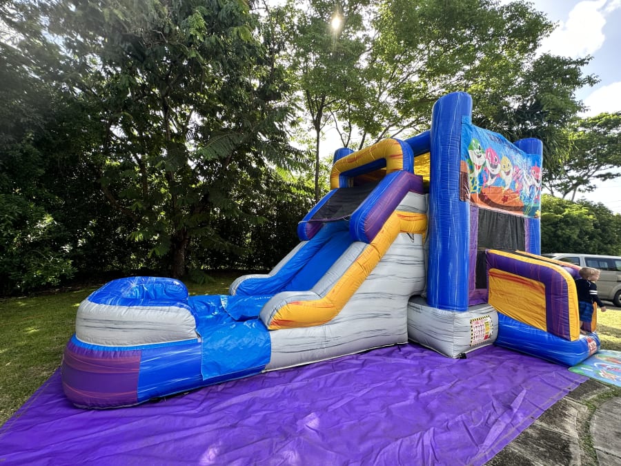 It's name is in its beauty. This 25ft jump 'n' slide is made of beautiful marble colours; purples, greys, blues and yellows with a grain of other accent colors running both horizontal and vertical. It features a bouncer interior, obstacles, basketball hoop and a climb step which leads to a slide. This bouncer can be used wet or dry. For our dry option please click here 13ft x 25ft Marble Jump N Slide Baby Shark Theme