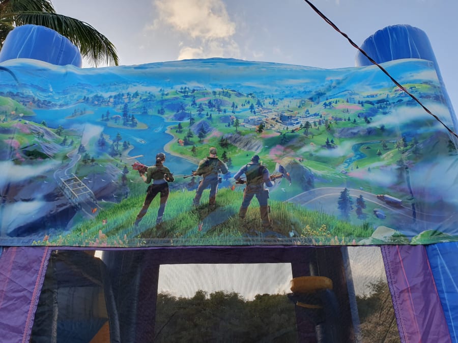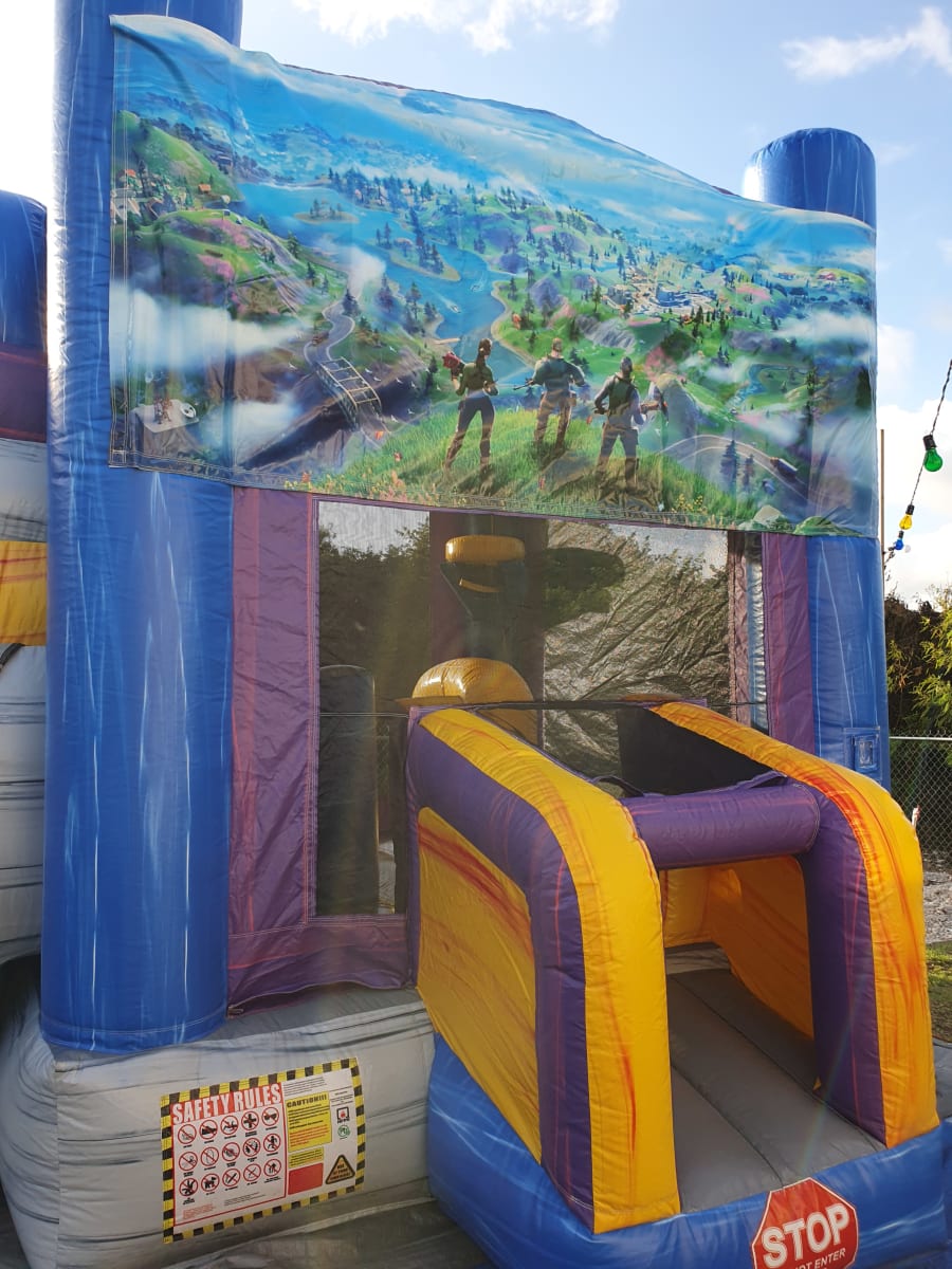 It's name is in its beauty. This 25ft jump 'n' slide is made of beautiful marble colours; purples, greys, blues and yellows with a grain of other accent colors running both horizontal and vertical. It features a bouncer interior, obstacles, basketball hoop and a climb step which leads to a slide. This bouncer can be used wet or dry. For our dry option please click here 13ft x 25ft Marble Jump N Slide FortNite Theme