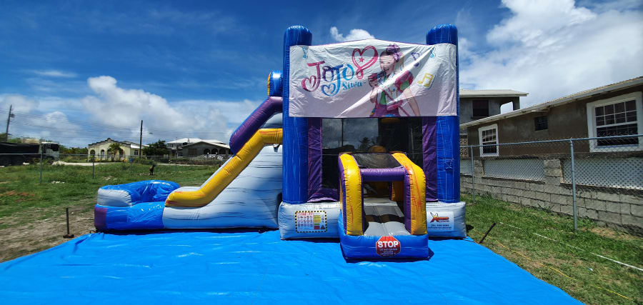 It's name is in its beauty. This 25ft jump 'n' slide is made of beautiful marble colours; purples, greys, blues and yellows with a grain of accent colours running both horizontal and vertical. It features a bouncer interior, obstacles, basketball hoop and a climb step which leads to a slide. This bouncer can be used wet or dry. For our wet option please click here 13ft x 25ft Marble Jump N Slide JoJo Siwa Theme