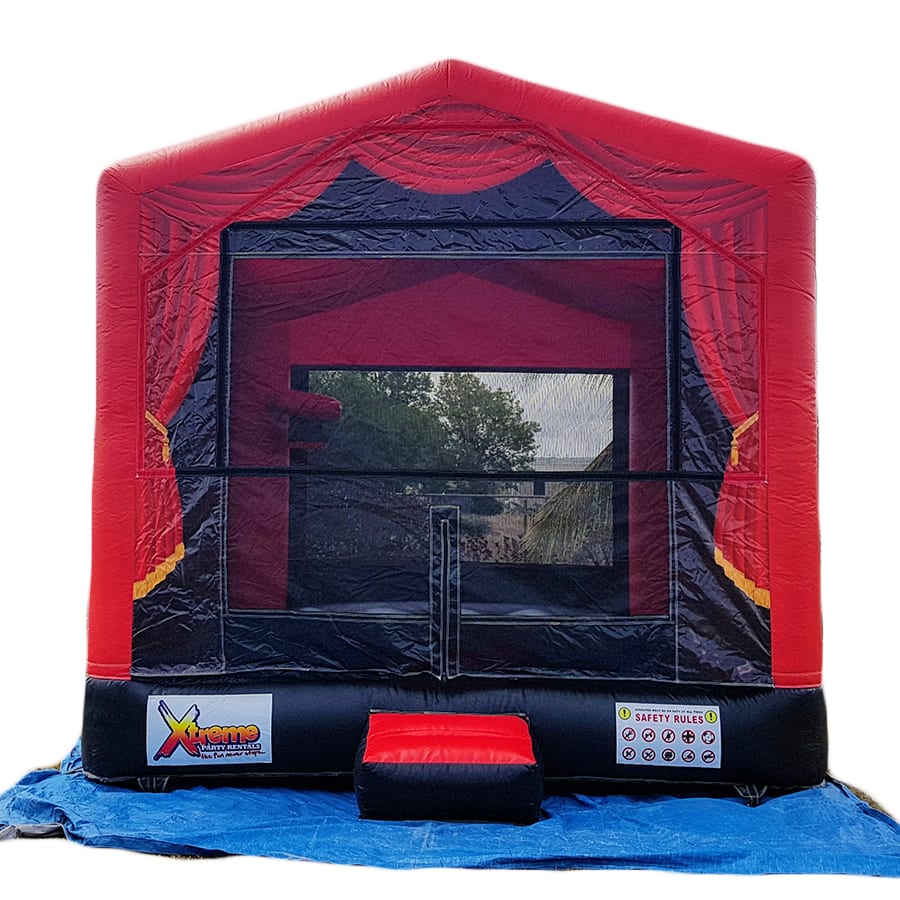 How about adding our movie theme designed bouncer to you backyard party or event? It features a classic movie premiere curtain printed design with iconic colours of red, gold and black. This 14ft x 13ft bouncer is the perfect size for kids of all ages to have a good time.