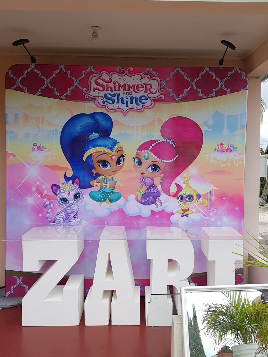 This backdrop measures 8ft (W) x 8ft (H), providing a vibrant and eye-catching display for your event. It features a colourful stretch backdrop that will instantly transport your guests into the enchanting world of Shimmer & Shine. 🎉🎈