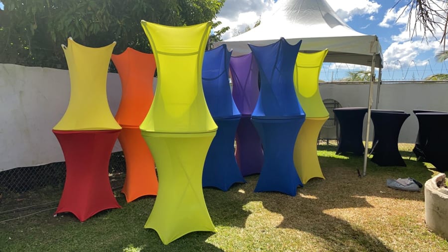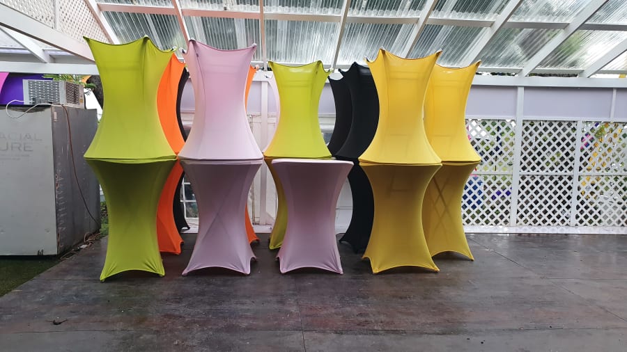 Our cocktail table with cover package is the perfect combo for decorators, event planners and any party host. They are suitable for events such as weddings, birthdays, showers, dinner rehearsals, corporate parties, simple family functions and whenever there is a requirement for functional, practical tables that are easy to use and to transport.