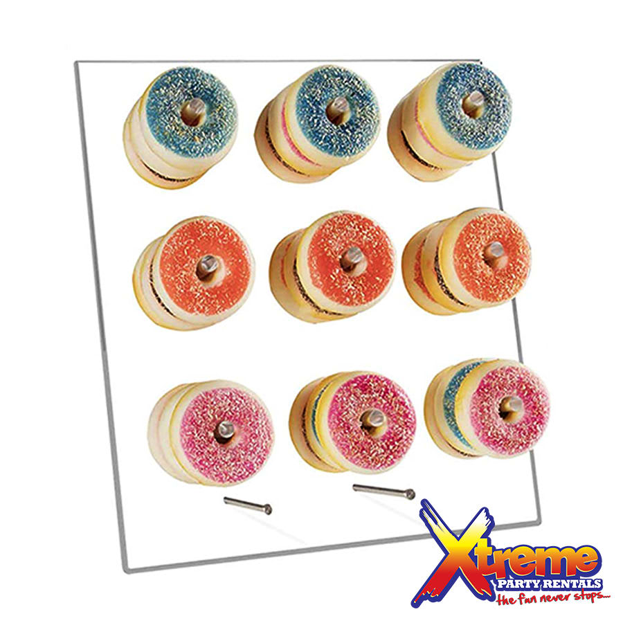 Display donuts in a fun and unique way with clear acrylic donut wall centerpiece. This acrylic donut display wall is easy to assemble with the included screws. It presents an easel board display with two feet on the bottom, keeping the donut holder stand stable on any dessert table or desktops. Size 13 x 12 inches. This donut wall has 9 pillars. Suitable for doughnuts under 3.5 inches in diameter, holds up to 27 donuts. Acrylic displays are the perfect choice to pair with Event Backdrops. Wow your guests at a picture perfect wedding, birthday, graduation party, baby or bridal shower event. Choose this today and lets give your desert the presentation it deserves.