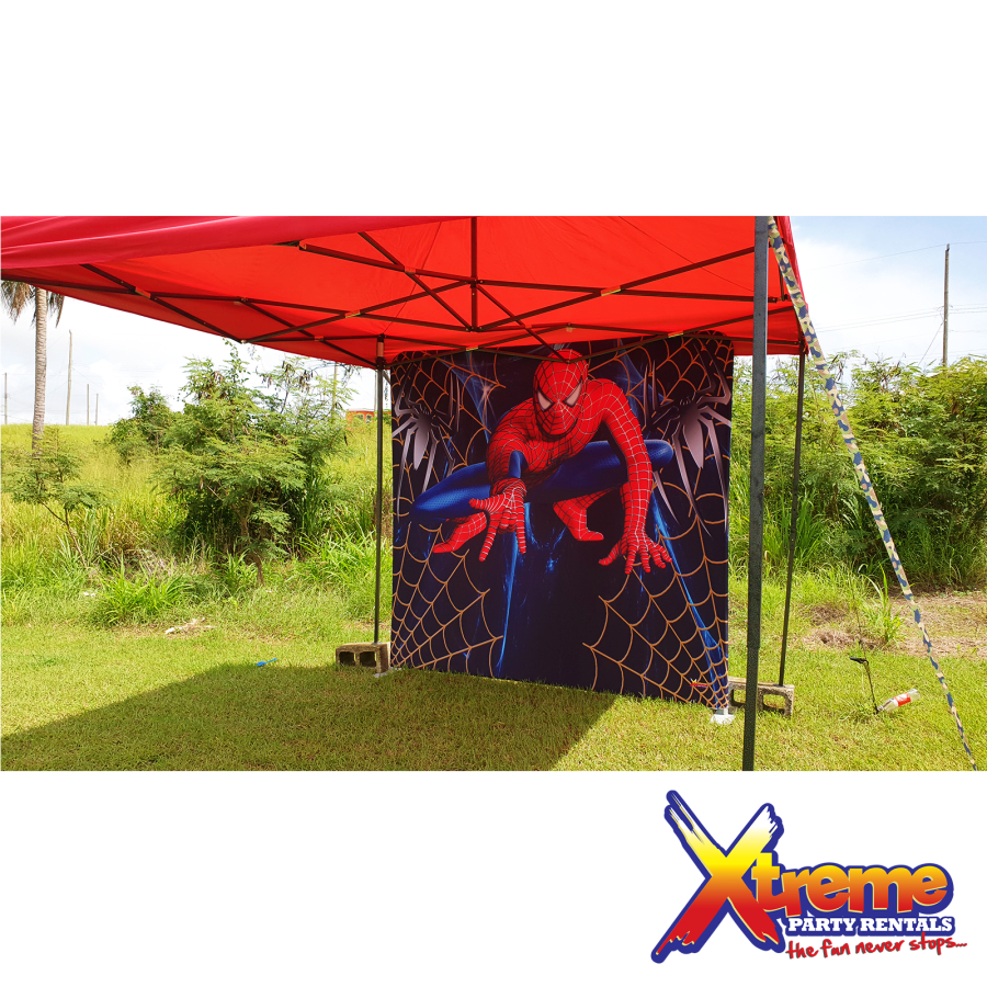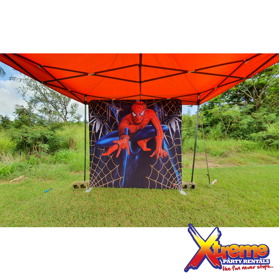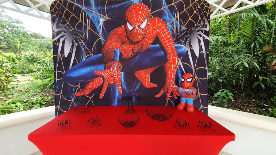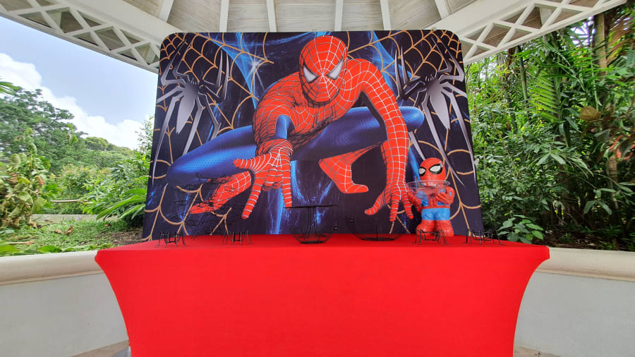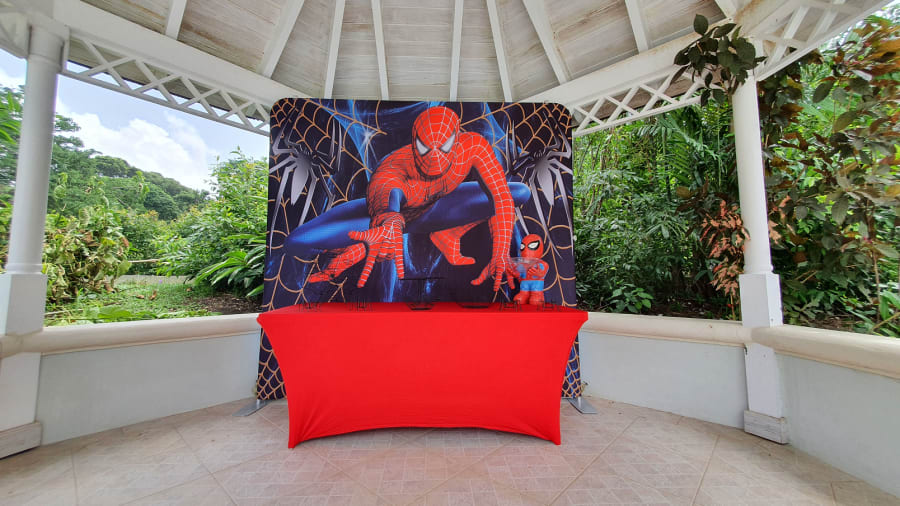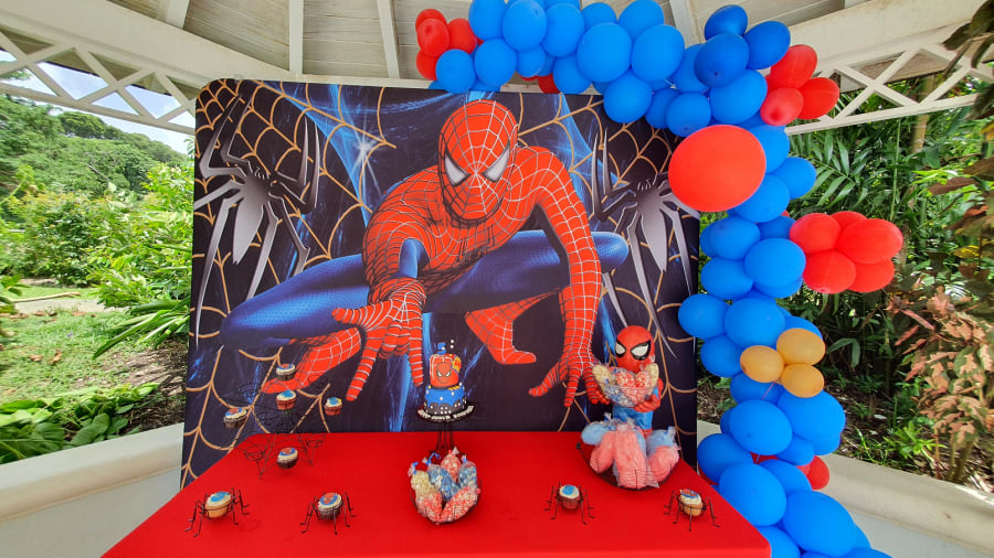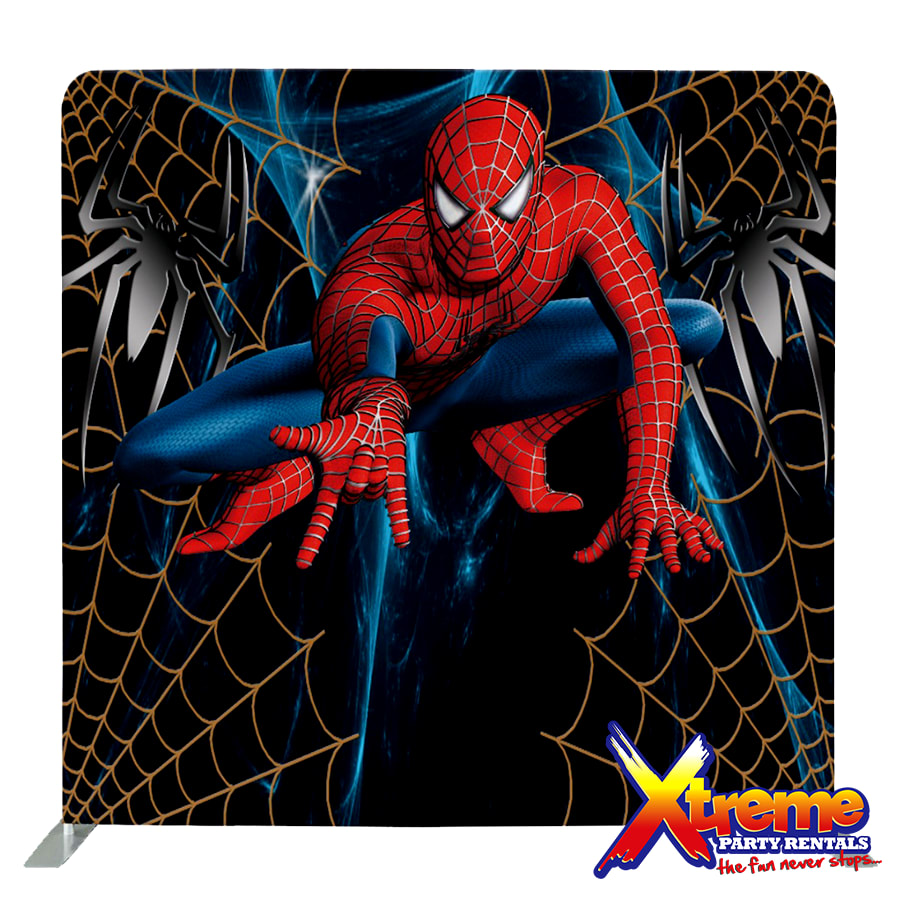 Spiderman Bouncer, 8ft Backdrop & Spiderweb Cake Stand Package