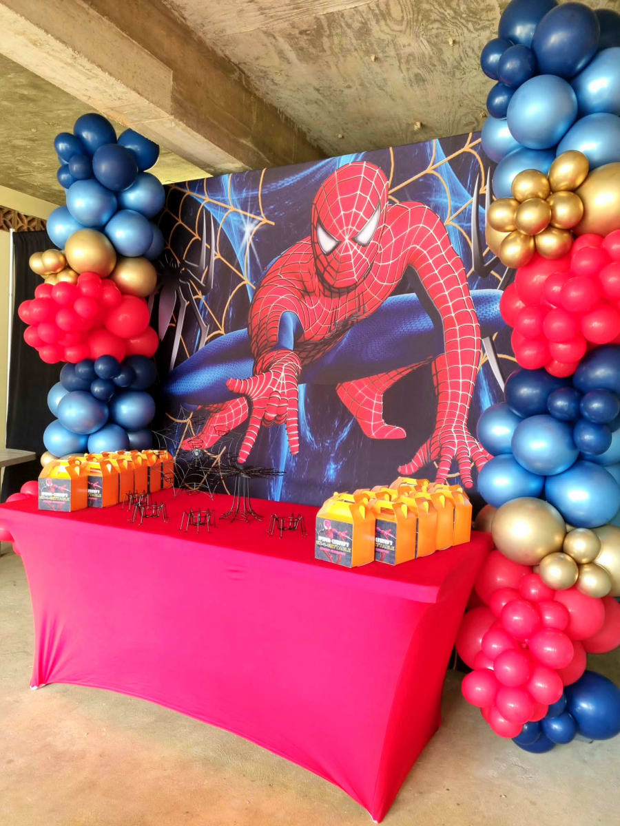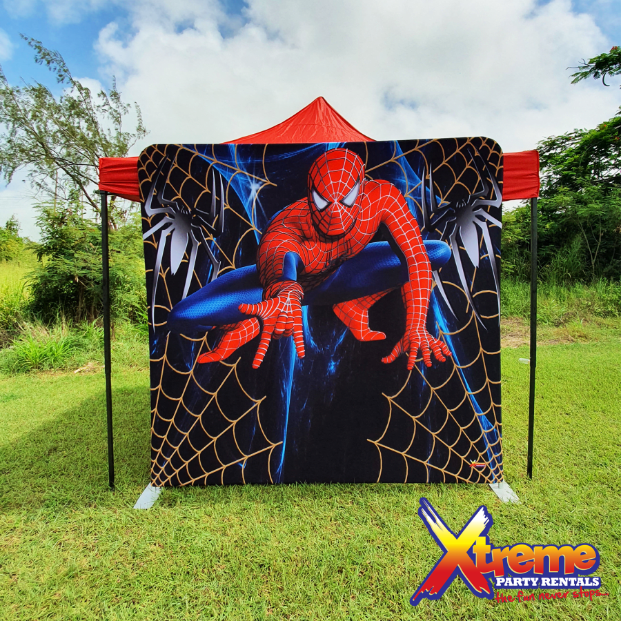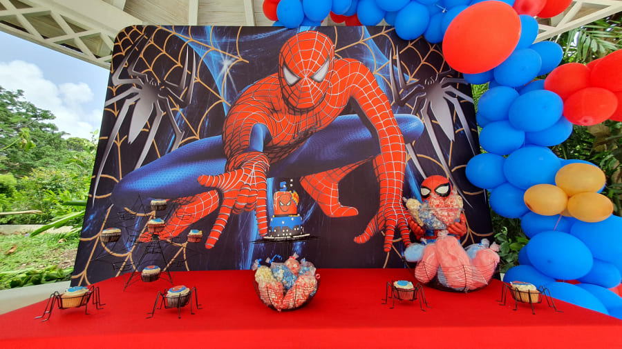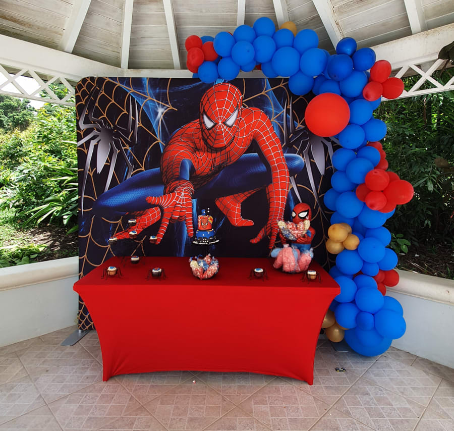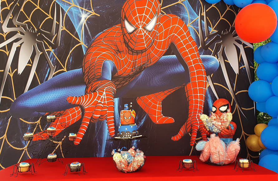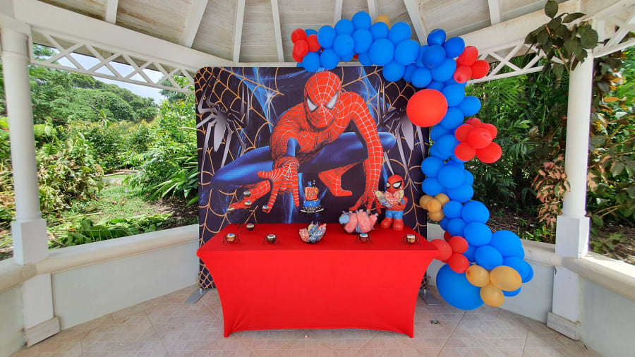 Spiderman Bouncer, 8ft Backdrop & Spiderweb Cake Stand Package