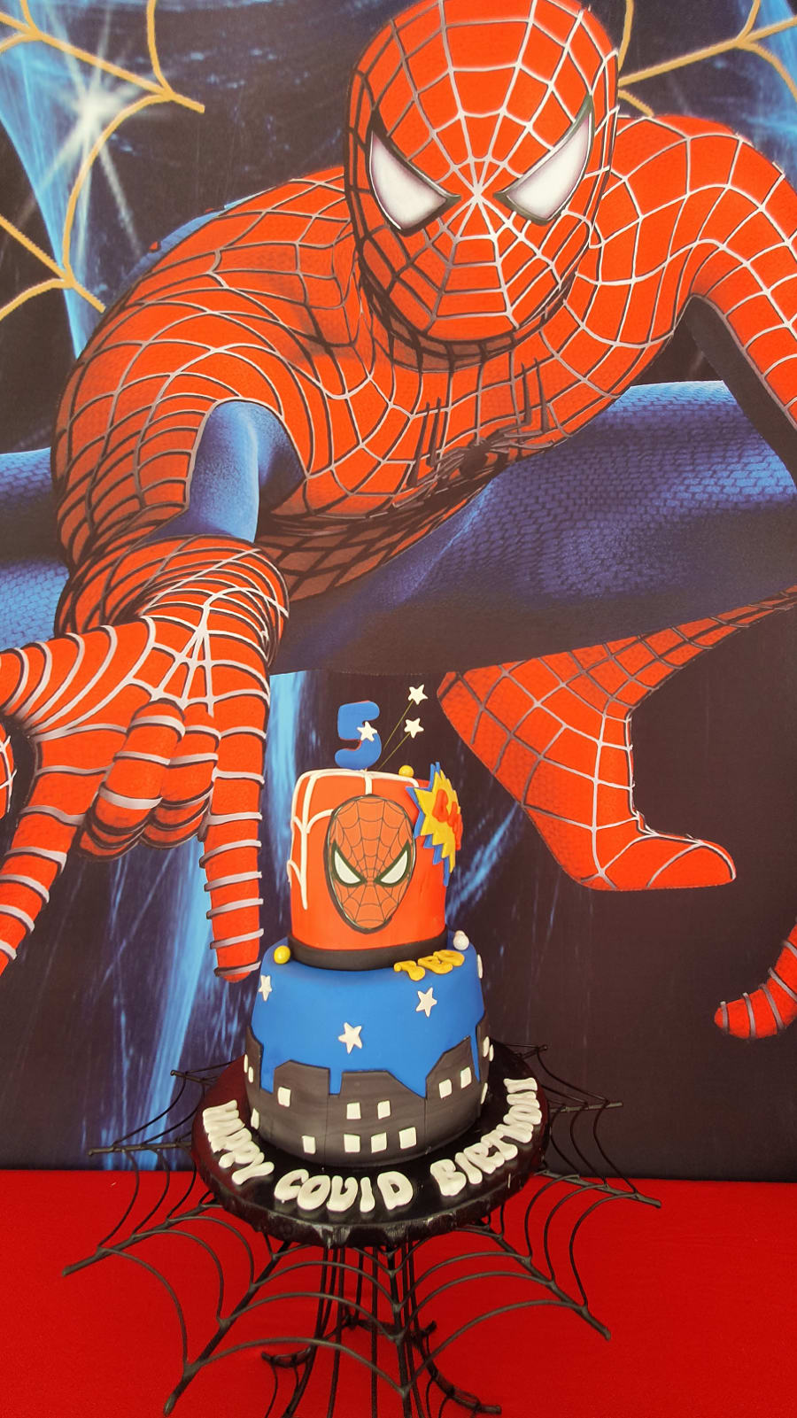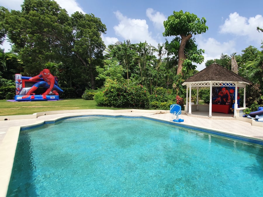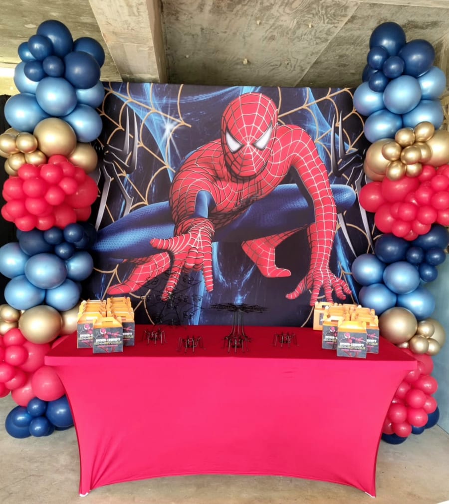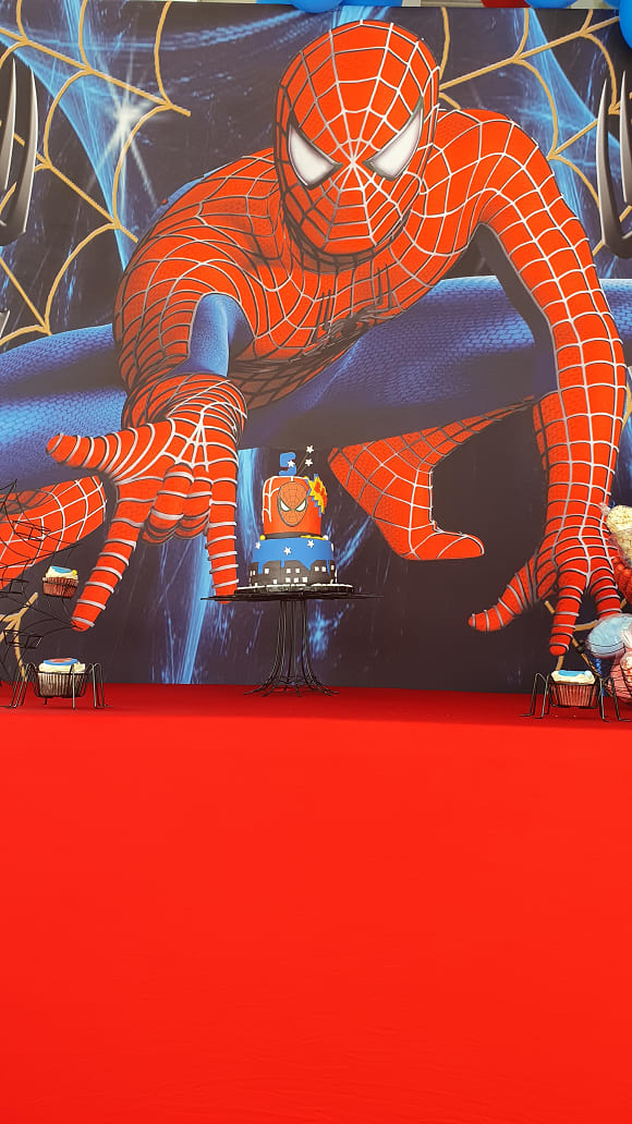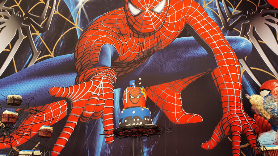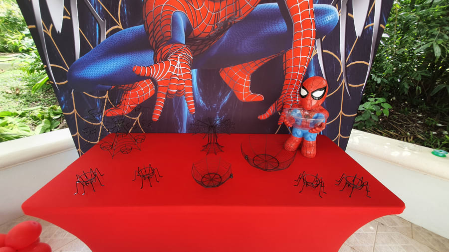Spiderman Bouncer, 8ft Backdrop & Spiderweb Cake Stand Package