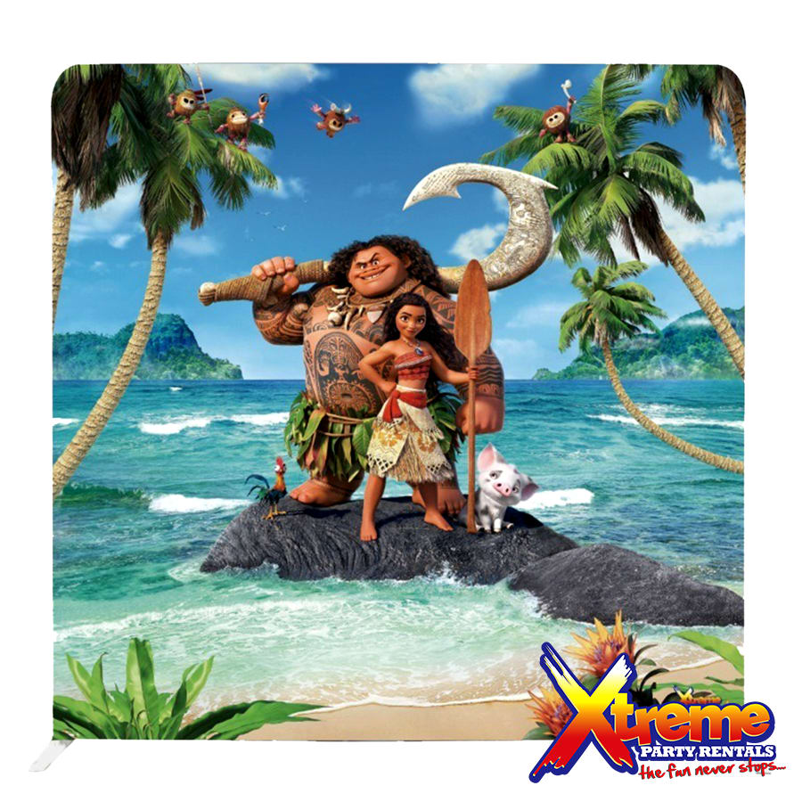 Measuring 8ft (W) x 8ft (H), this backdrop provides a large and captivating display that will impress your guests. The colorful stretch backdrop features the beloved characters from the Moana movie, including Moana herself, Maui, and the adorable Pua and Hei Hei. With its high-quality graphics, it will create a stunning focal point for your event.