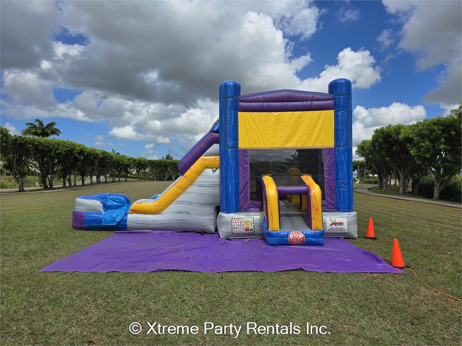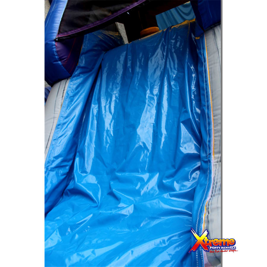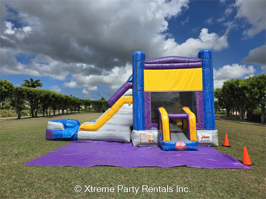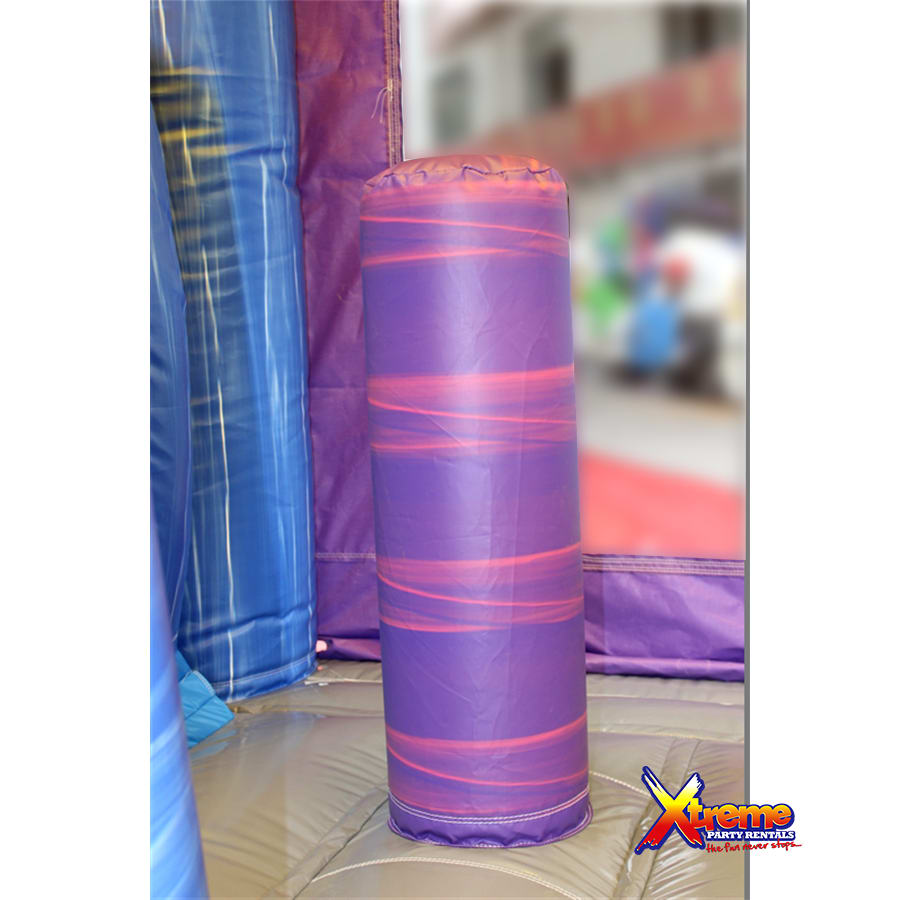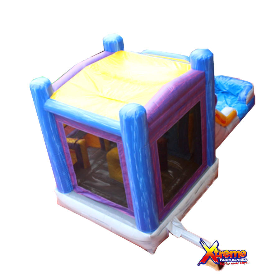 It's name is in its beauty. This 25ft jump 'n' slide is made of beautiful marble colours; purples, greys, blues and yellows with a grain of accent colours running both horizontal and vertical. It features a bouncer interior, obstacles, basketball hoop and a climb step which leads to a slide. This bouncer can be used wet or dry. For our wet option please click here 13ft x 25ft Marble Jump N Slide-No Theme