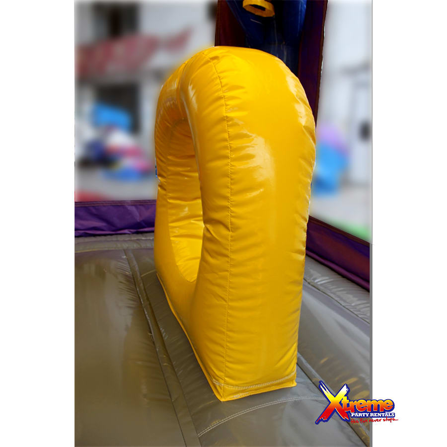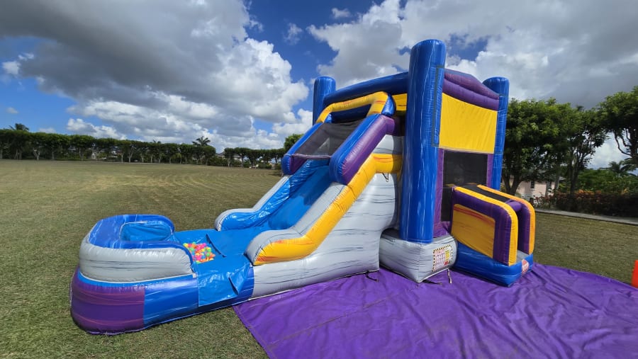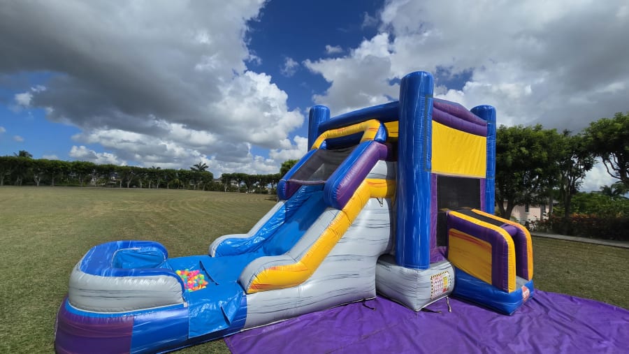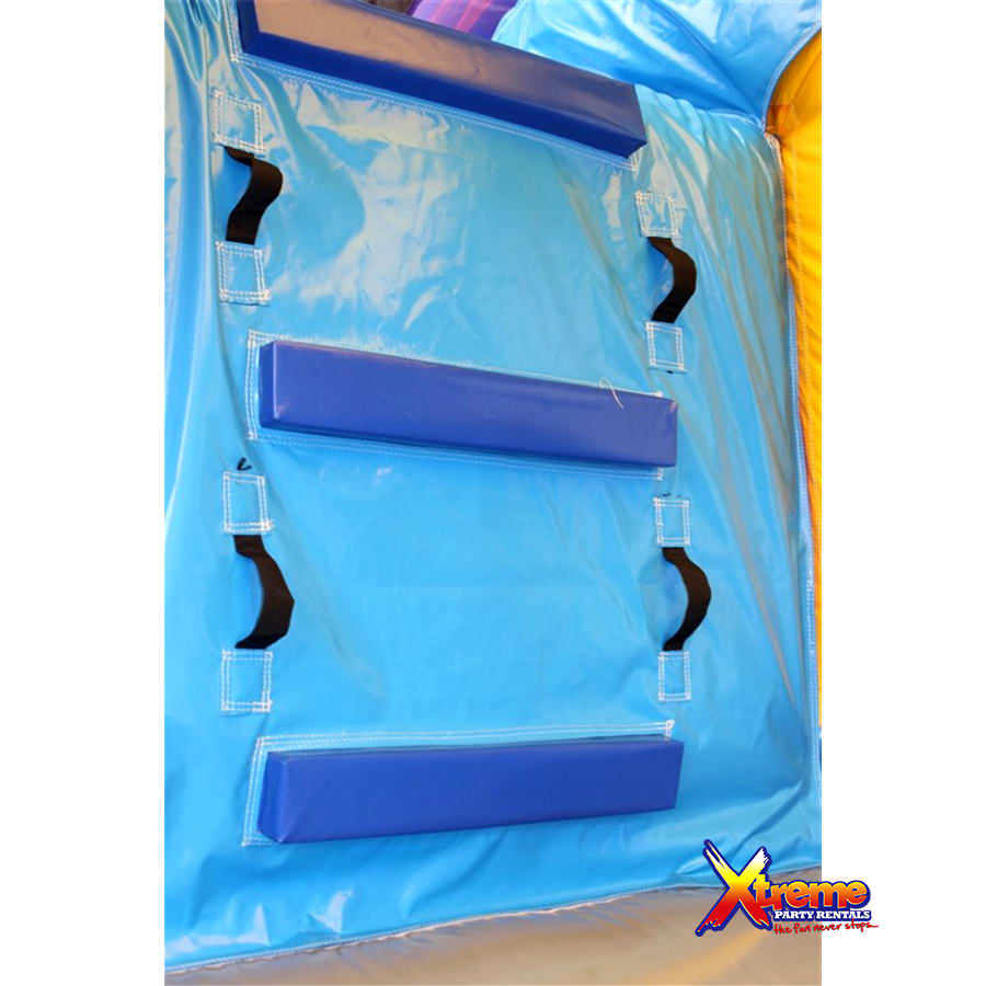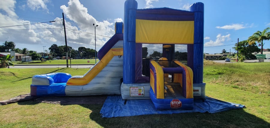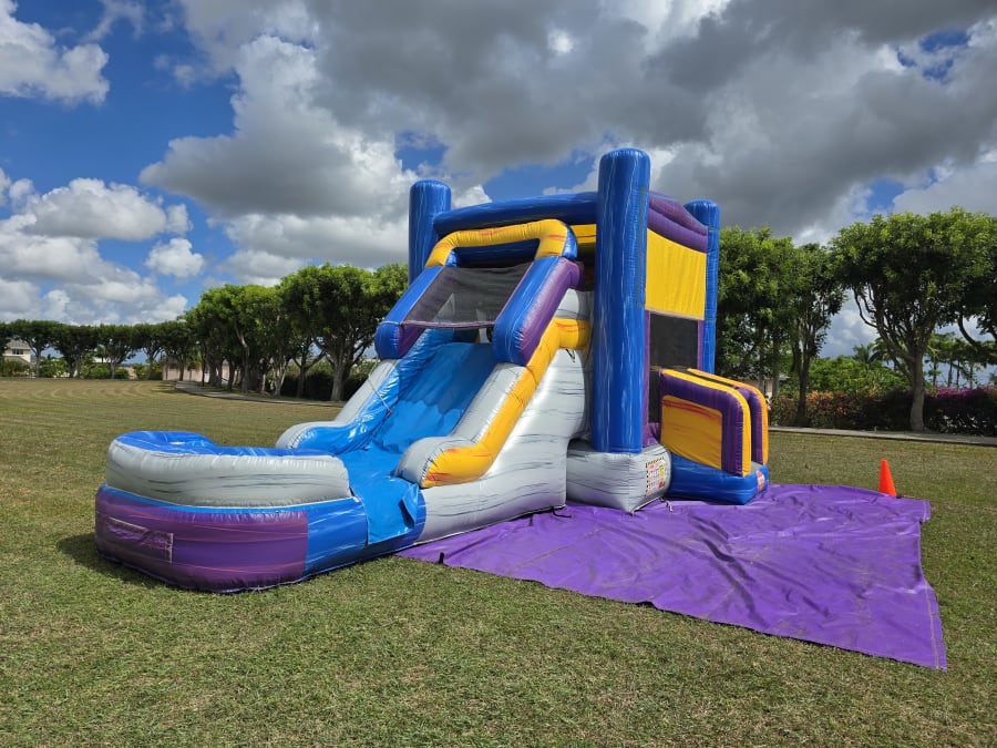 It's name is in its beauty. This 25ft jump 'n' slide is made of beautiful marble colours; purples, greys, blues and yellows with a grain of accent colours running both horizontal and vertical. It features a bouncer interior, obstacles, basketball hoop and a climb step which leads to a slide. This bouncer can be used wet or dry. For our wet option please click here 13ft x 25ft Marble Jump N Slide-No Theme