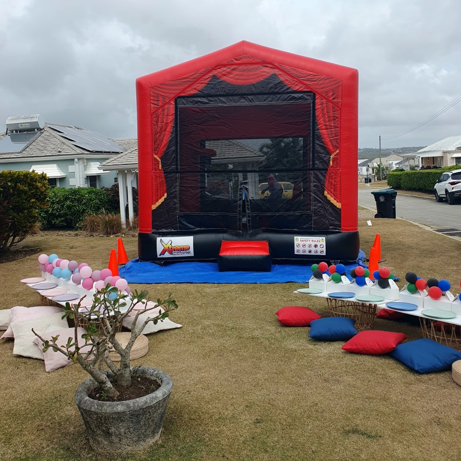 How about adding our movie theme designed bouncer to you backyard party or event? It features a classic movie premiere curtain printed design with iconic colours of red, gold and black. This 14ft x 13ft bouncer is the perfect size for kids of all ages to have a good time.