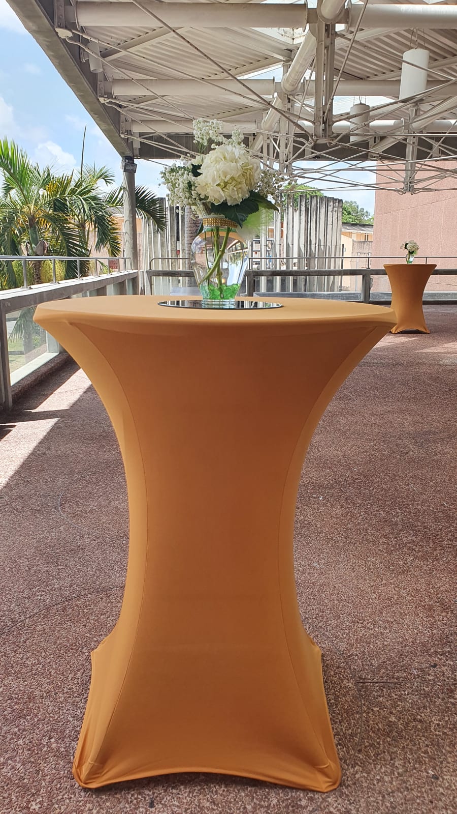 These 32 inches diameter x 43 inches table height cocktail spandex fitted tablecloth are for round cocktail table with 4 legs base. Our High folding cocktail table covers are suitable for events such as weddings, birthdays, showers, dinner rehearsals, corporate parties and simple family functions and whenever there is a requirement for functional, practical tables that are easy to use and to transport.