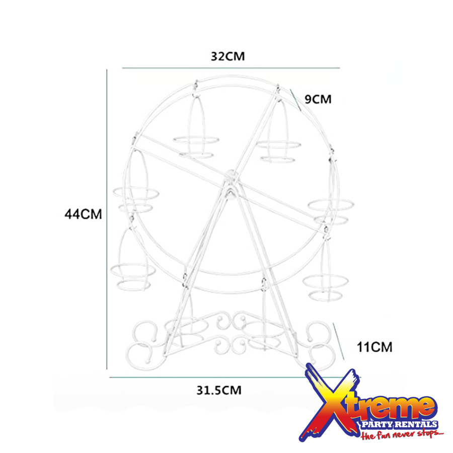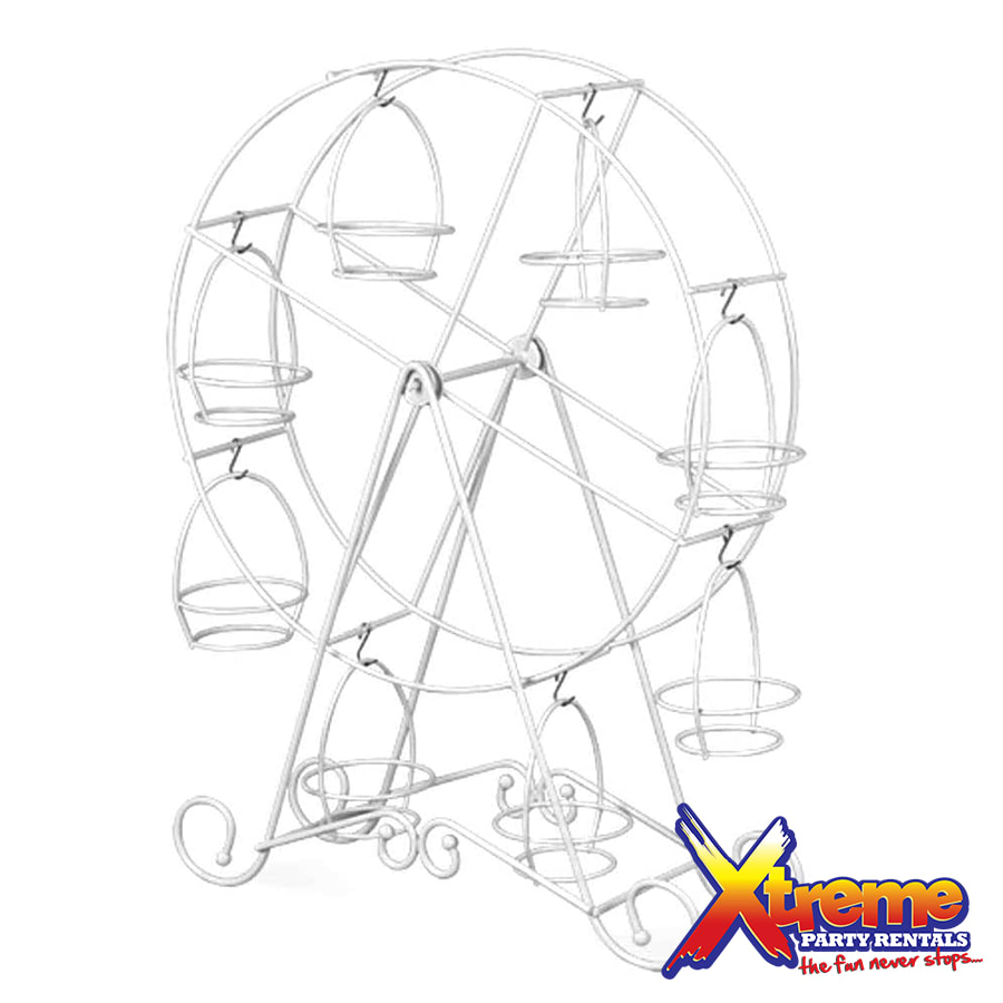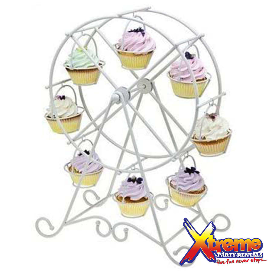 The Ferris Wheel Cupcake Display adds a fun whimsical touch to your table décor. It's design adds to the nostalgia of going to the fair; which makes it ideal for carnival and circus theme parties. This cupcake stand is about 13" diameter and holds 8 cupcakes. It is also ideal for weddings, baby showers, birthday and adult parties.