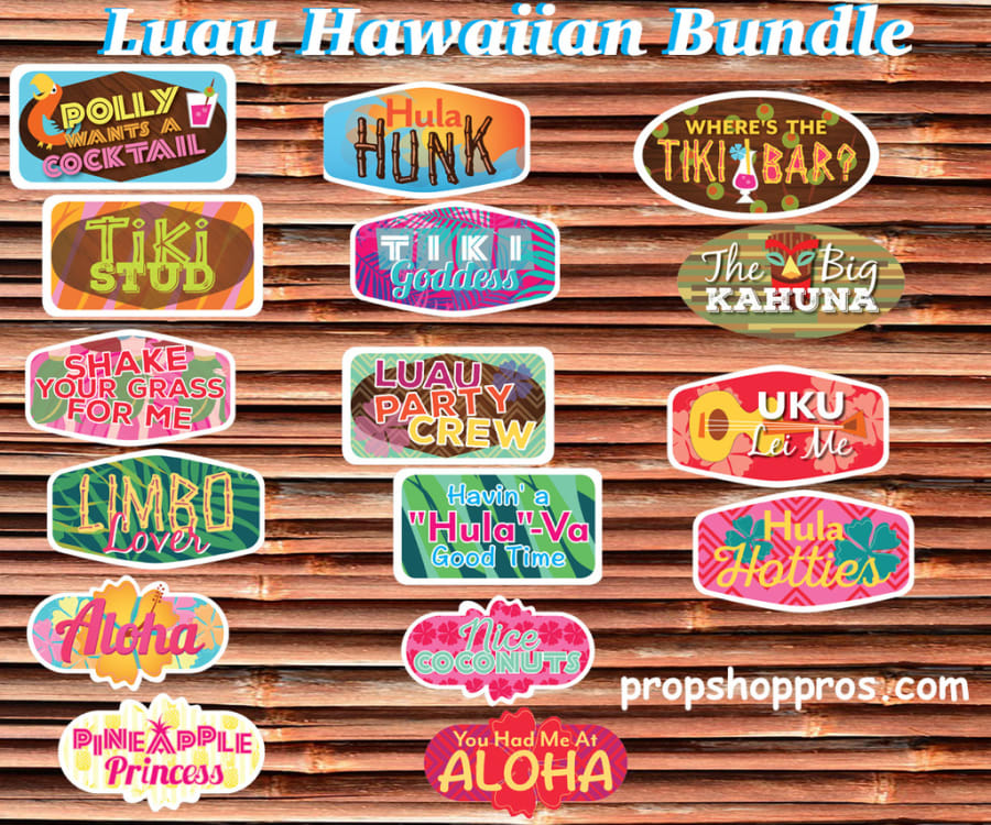This bundle has 8 double sided themed prop signs which feature graphics and words suitable for an aloha, luau, tiki or Hawaiian themed event. These are guaranteed to be a hit at your themed event, private party, wedding, corporate event and much more.