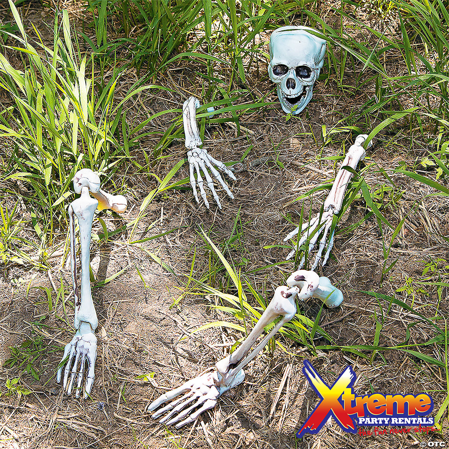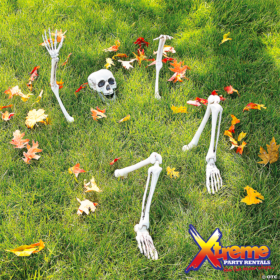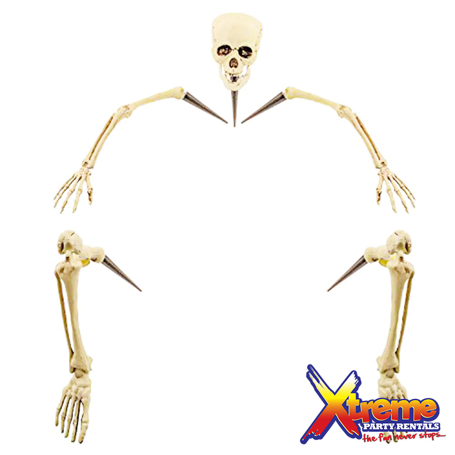 Add this leering, life-sized skeleton to your collection of Halloween directions and celebrate fright-night in spooky style! A yard decoration that's guaranteed to make the neighborhood shiver, it's a classic. Anchor this bag of bones in your garden, train the spotlight on him and watch the trick-or-treaters run! Includes two 27" legs, two 18 1/2" arms, one 7" x 7" skull and four 5 3/4" stakes.