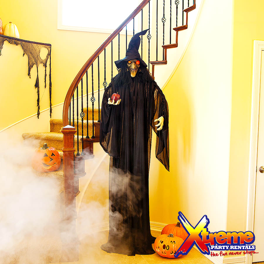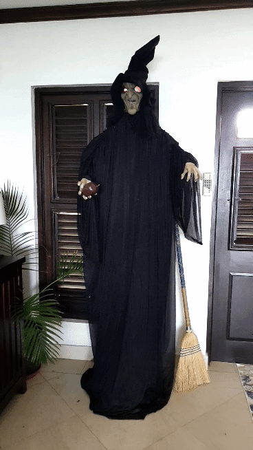 Every Halloween haunted house needs a scary witch! This Standing Witch with Red Apple is the perfect Halloween decoration that is sure to turn any home, doorway or covered outdoor area into a frightening scene. Use this witch with evil eyes as a scary prop at your Halloween party or scare and entertain trick-or-treaters as they approach your home. Complete with plastic stand, this tall witch will loom over all your guests. Features flashing red eyes and loud noise activation. Plastic. Arms stretched out,