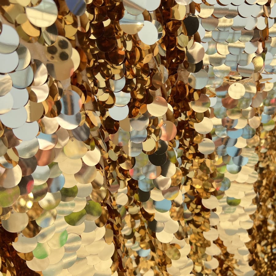 This Shiny Gold Sequin Backdrop features large mermaid sequins and is an excellent choice for adult or children parties - weddings, birthday parties, disco themes, baby showers and occasions of any kind. Pair it with drapes and sheers or use it alone. Make a statement with our eye-catching mermaid sequin backdrop that catches the light and adds a touch of luxury to any occasion. The large 8ft x 8ft size provides ample coverage for your backdrop needs, allowing you to create a stunning focal point for photos and event decor. Our Mermaid Sequin Shiny Gold backdrop is perfect for a variety of events, including weddings, baby showers, proms, and more. Create a memorable photo booth backdrop or use it as a stunning backdrop for your event space. The versatile design and high-quality construction make it a must-have for any event planner or photographer looking to make a statement.