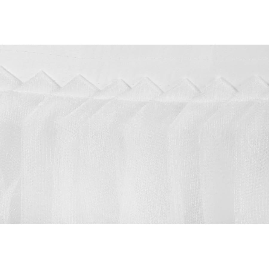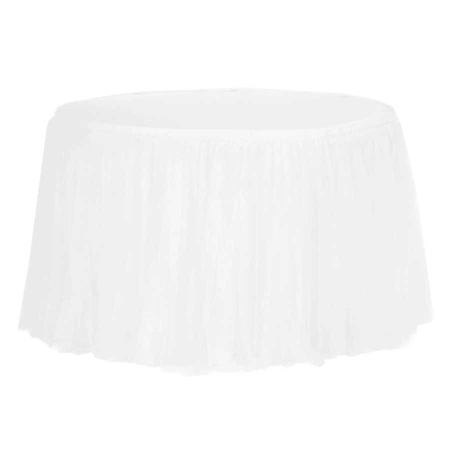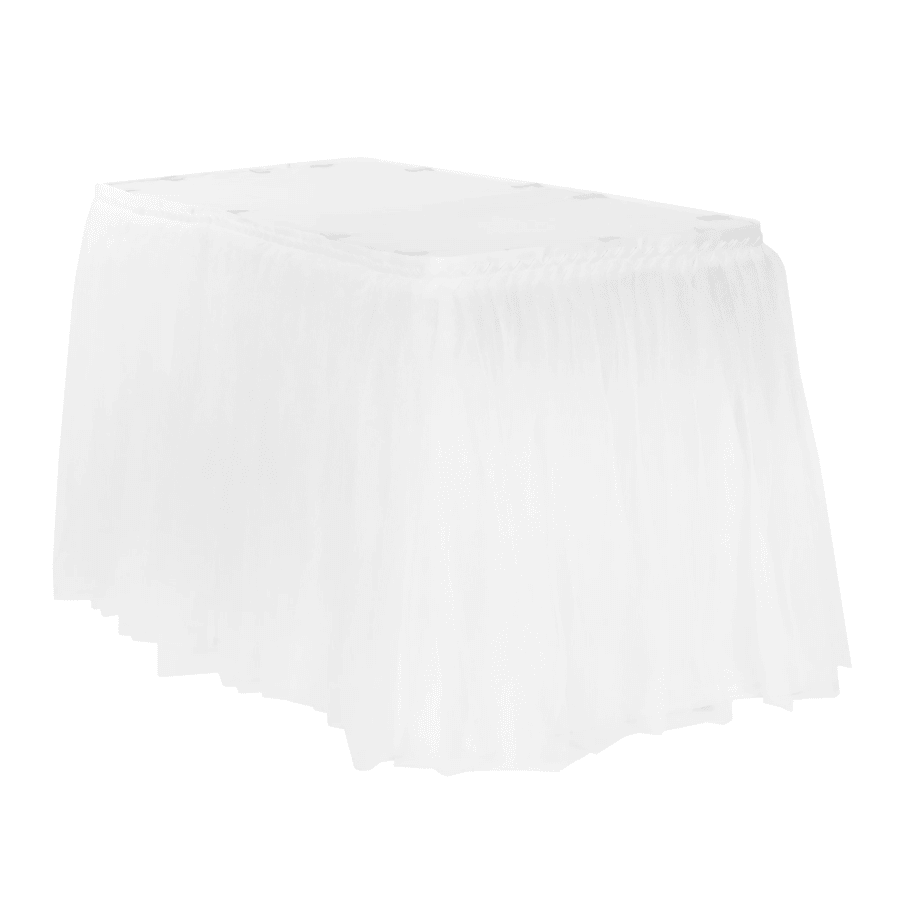 17ft will cover 4 sides of a 6ft rectangular table. Each table skirt features individual strands of ample, reinforced mesh upon a thick and durable lamour satin band.