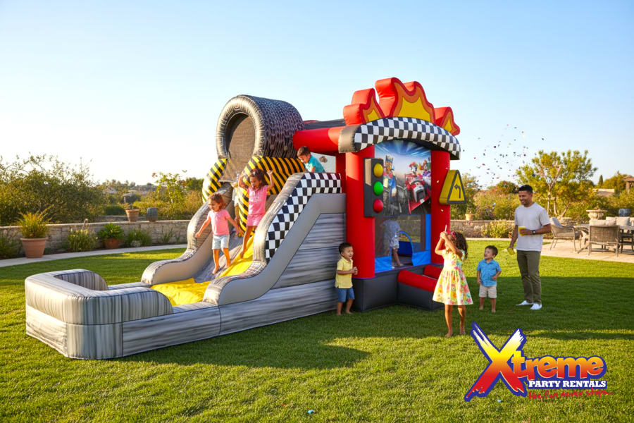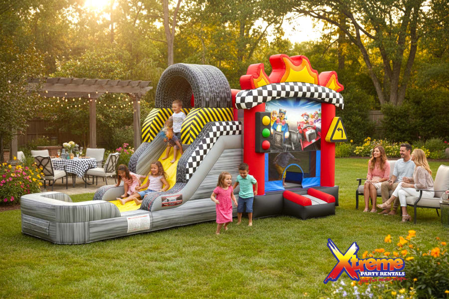 Take your event to the next level by pairing the Raceway Jump N' Slide with our other race-related rentals. Create a complete racing experience with our backdrop options, allowing kids to feel like they're on a real race track. For added excitement, consider renting our kid and adult ATVs, giving guests the opportunity to channel their inner race car driver.