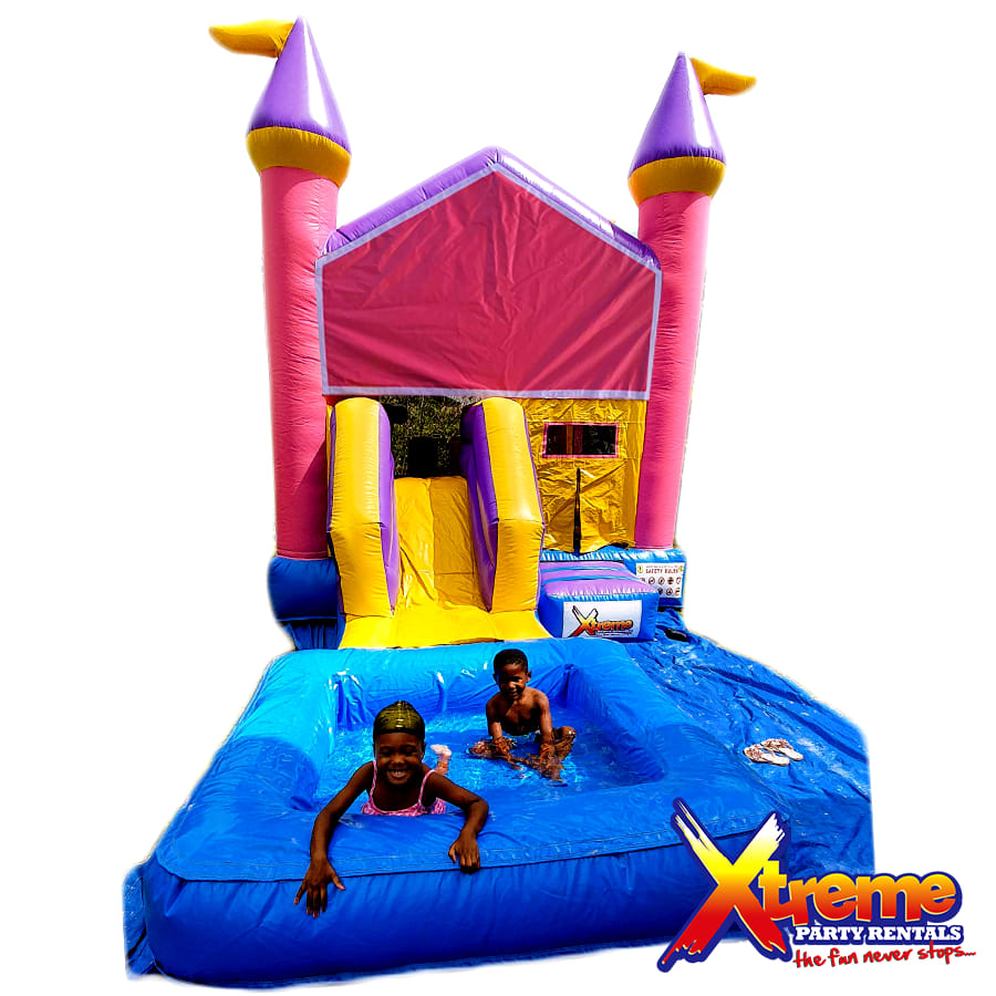 It features a splash pool at the front of the slide where kids can jump, soak and splash. For our dry option check out our Bouncy Castles