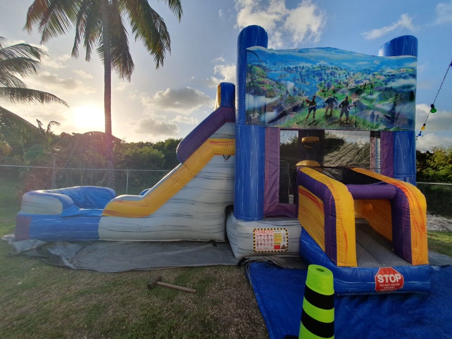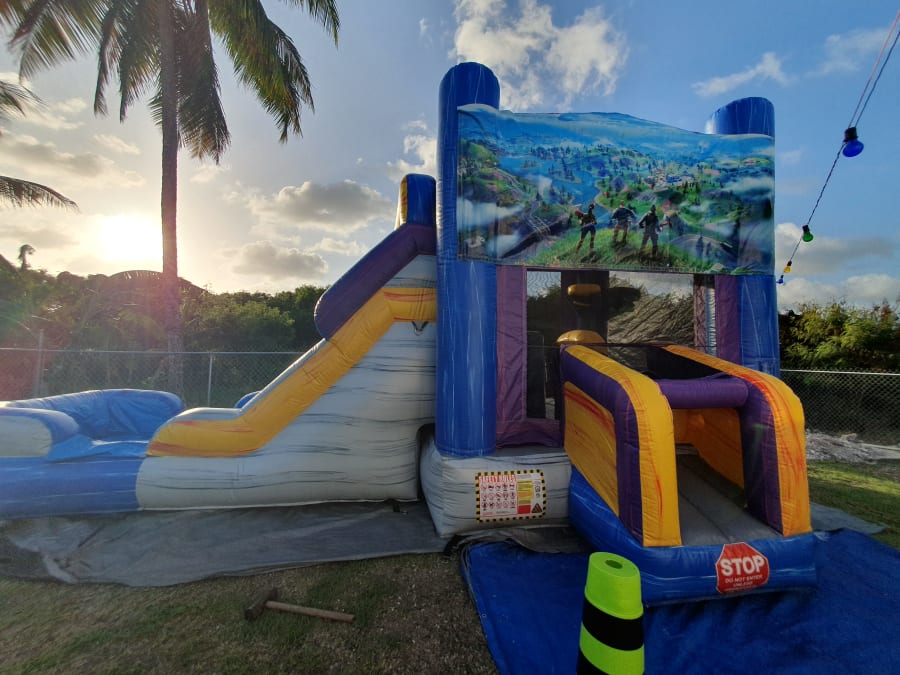 It's name is in its beauty. This 25ft jump 'n' slide is made of beautiful marble colours; purples, greys, blues and yellows with a grain of other accent colors running both horizontal and vertical. It features a bouncer interior, obstacles, basketball hoop and a climb step which leads to a slide. This bouncer can be used wet or dry. For our dry option please click here 13ft x 25ft Marble Jump N Slide FortNite Theme