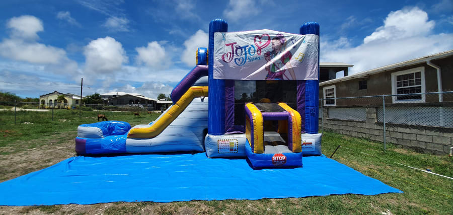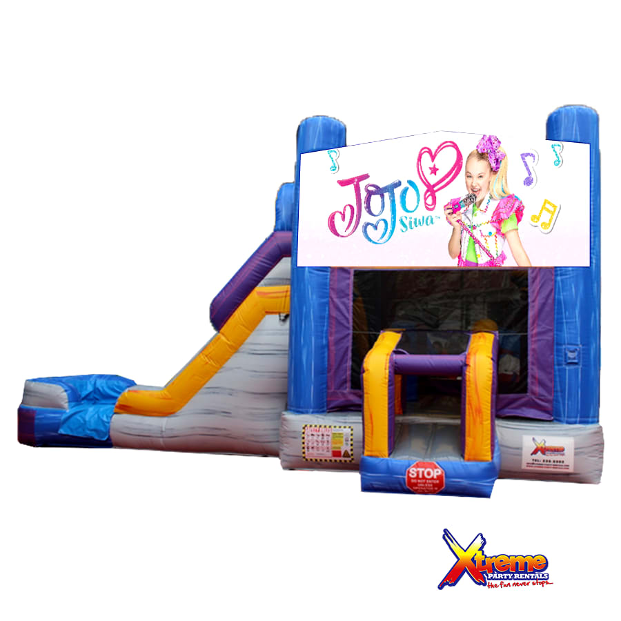 It's name is in its beauty. This 25ft jump 'n' slide is made of beautiful marble colours; purples, greys, blues and yellows with a grain of accent colours running both horizontal and vertical. It features a bouncer interior, obstacles, basketball hoop and a climb step which leads to a slide. This bouncer can be used wet or dry. For our wet option please click here 13ft x 25ft Marble Jump N Slide JoJo Siwa Theme