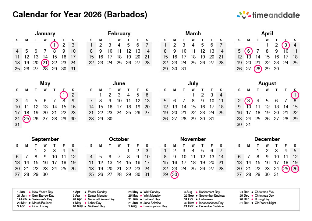 08 January 26 - 2026 Calendar with Barbados Holidays